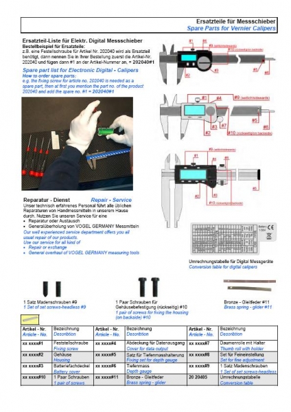 Ersatzteil-Liste für Elektr. Digital Messschieber