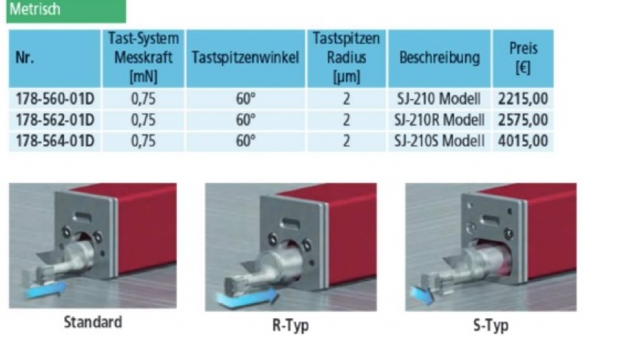 - Standard-Taster (178-395): Abtastmethode Induktionsmethode Messbereich 350 µm Tasterspitze Diamant-Spitze Spitzenradius 2 µm Radius Messkufe 40 mm Mess-/ Antastkraft 0,75 mN Gewicht 18 g
